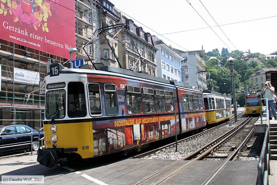 Stuttgart - Straßenbahn - 618 Triebwagen 618 am 08. Juni 2007 auf Linie 15 an der U-Bahn-Haltestelle Olgaeck.