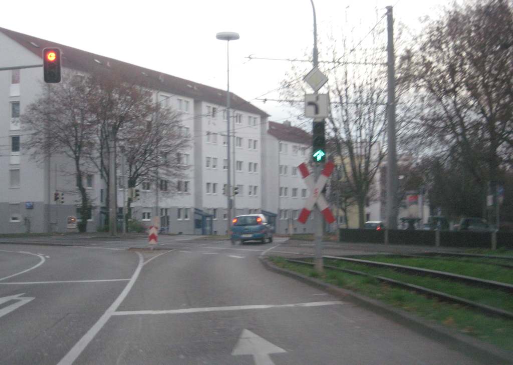 SSB Streckenführung der U7 am Rotweg in Stgt.-Rot. Dezember 2016. Blick Richtung Zuffenhausen. In diesem Bereich sind etliche, ampelgesichterte Bü hintereinander, was bei Durchfahrt eines Doppel-DT8 zu Staus auf der Strasse führen kann. Photo by M.Koblischka |