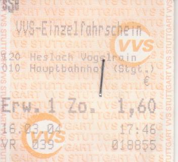 One way ticket for a trip beetwen Heslach Vogelrain and Hauptbahnhof mit dem stadtbahn in Stuggart. 2004