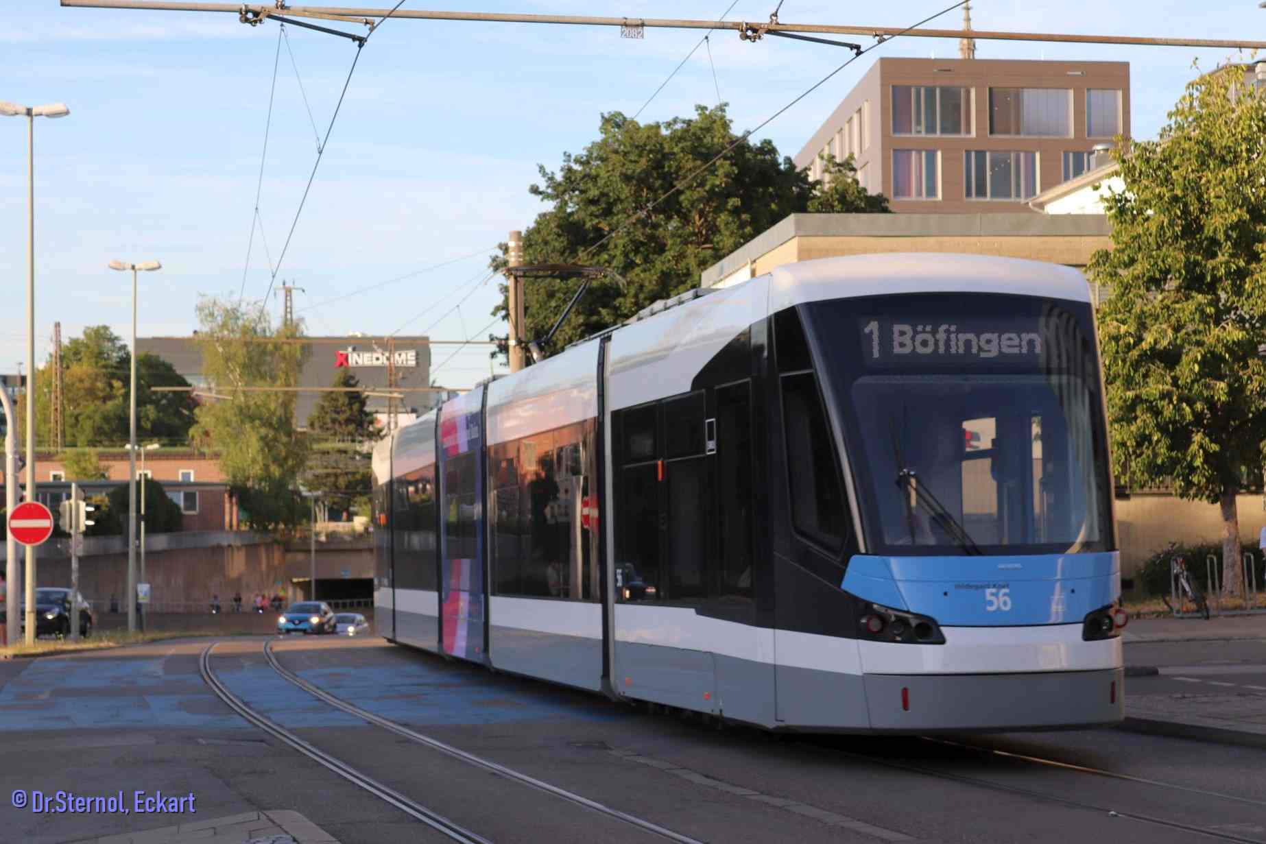 | Wagen 56 hat eben die Hst Ehinger Tor verlassen und schickt sich an, den Hbf zu unterqueren. Er Fährt auf Linie 1, d.h. die Neufahrzeuge sind nicht nur auf Linie 2 zu sehen. Dr. Sternol, Eckart (Foto), Dr.Sternol@t-online.de |