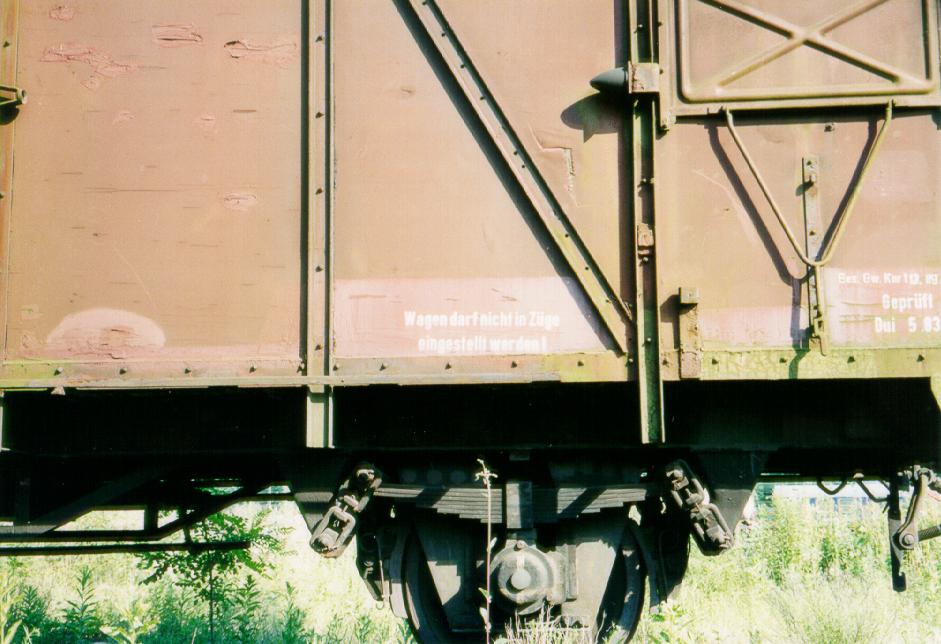 An older covered wagon used as storage shed, detail view ("Wagen darf nicht in Züge eingestellt werden" = Wagon must not be included in trains)