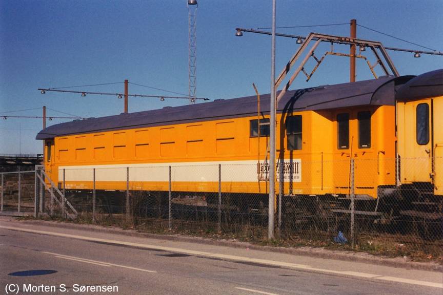 Exhibition-car owned by "Expotrain", a former postal car Pm, in the Glostrup Station, Copenhagen 2003. Ausstellungswagen der Gesellschaft "Expotrain", ein früheren Bahnpostwagen Pm, in Bahnhof Glostrup, Kopenhagen 2003.