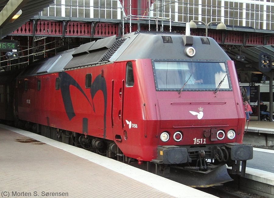 DSB ME 1511, one of only two red liveried ME locos. Unfortunately both have since been covered with blue foil. Copenhagen Central Station on the 26/7 2005. DSB ME 1511, einer von nur zwei rotlackierten ME-loks. Heute sind sie leider beide mit blauer folie unterwegs. Kopenhagen Hauptbahnhof am 26/7 2005.