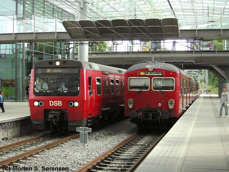 DSB S-train of 3'rd generation MC-FC 11-12, and 2'nd generation MM-FU-MU-FS set 87 at Flintholm Station on the 15. of june 2006. DSB S-bahnzug vom 3. generation MC-FC 11-12, und 2. generation MM-FU-MU-FS zug 87 bei Bahnhof Flintholm am 15/6 2006.>p> Photo by: Morten S. Sørensen |