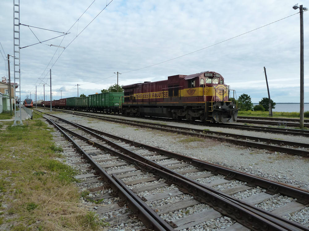 EVR - Estonia Paldiski has a large port and several freight trains a day run here from Tallinn over the electrified line. Locomotive C36-7i 1546 is stabled with a freight train, to the left is the passenger station with a passenger train. Paldiski, 25-06-2014 Digital photo by Marco van Uden |