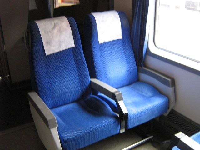 Airline-style seating. Whereas B10t arrangement guarantees a decent seat-pitch, those reversible backs tend to pre-empt some legroom, though... Irún, Estación Internacional/Nazioarteko Geltoki. 14th August 2006.