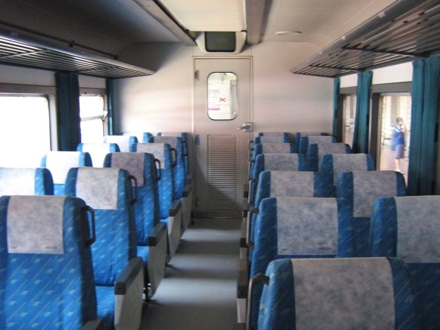 Turista-class seating-area. Airline-style seating. Whereas BR3t arrangement guarantees a decent seat-pitch, those reversible backs tend to pre-empt some legroom, though... Irún, Estación Internacional/Nazioarteko Geltoki. 14th August 2006.