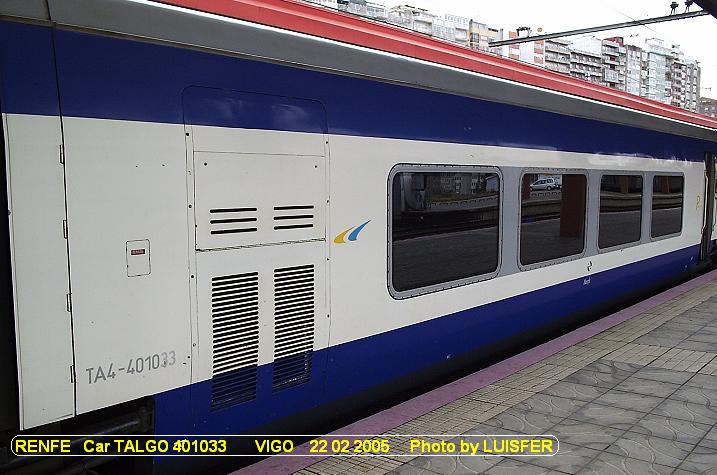RENFE Talgo Car 401033 in VIGO Station (22 02 2005) RENFE Carruagem Talgo 401033 na Estação de VIGO Photo by LUISFER - Estudos e Realizações Ferroviárias (http://luisfer.fotopic.net) (blogluisfer@sapo.pt) |