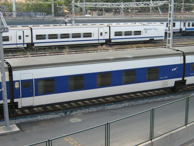 Originally built to launch the "Paris-Madrid Talgo" (31st May 1981), the Talgo 5 fleet was displaced as from 2nd June 1991 to Barcelona-Andalucia sleeper services, using the Madrid-Sevilla HSL until 26th January 2002. Barcelona-San Andreu Comtal. 9th June 2006.