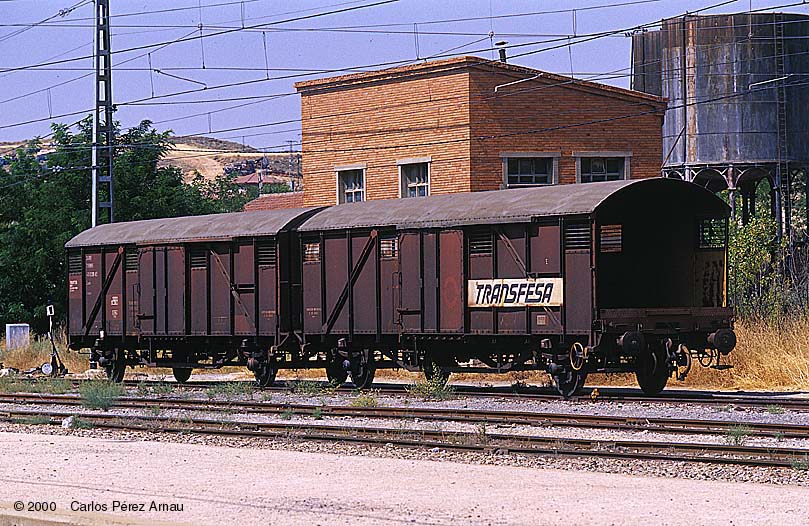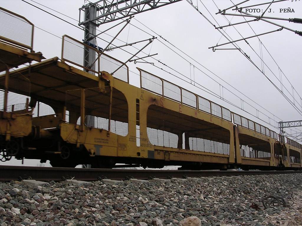 Vagon de 2 pisos portacoches, compuesto de 2 vagones indivisibles y 3 ejes. Double-deck car carrier, made up of 2 indivisible boxcars and 3 axes. Company: SEMAT / Customer: POOL IBERICO FERROVIARIO Station: Valladolid 08/2002