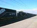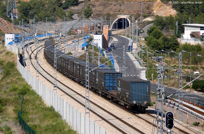 Tren puro de 20 Plataformas del operador Combinalia, que realiza el trafico para Repsol-Butano, entre Tarragona y Castellon. Pure train of 20 Platforms of the operator Combinalia, who realizes the traffic for Repsol-butane, between Tarragona and Castellon. Station: Moncofar (Castellon) - 27/09/2004
