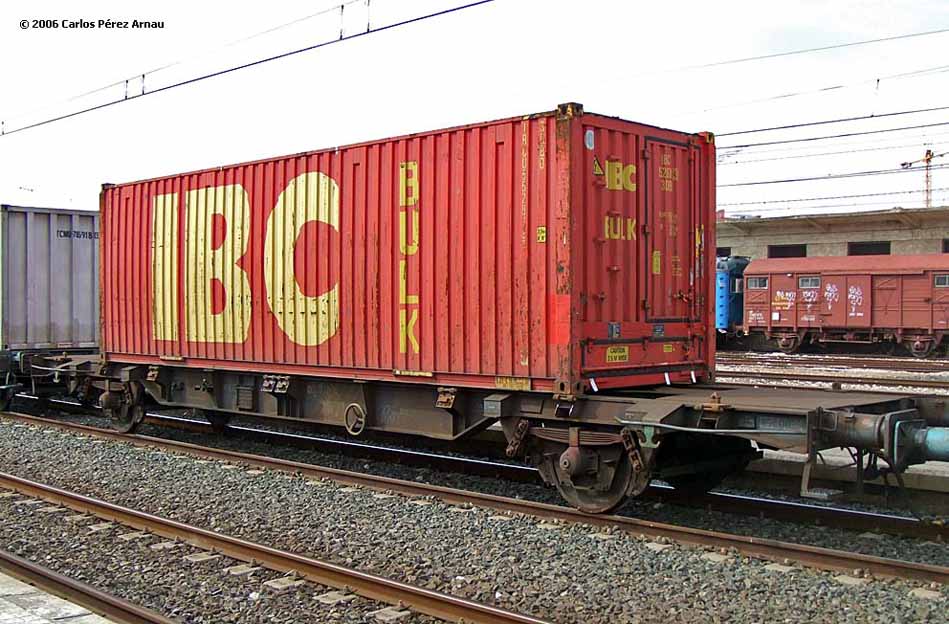 Vagon plataforma de la empresa TRANSFESA, con un contenedor de la empresa Consent Leasing. Coach platform of the company TRANSFESA, with a container of the company Consent Leasing. Station: Reus (Tarragona) - 23/02/2006