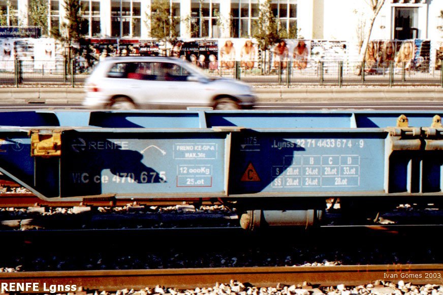 RENFE flat wagon type Lgnss for container transport. Side lettering detail. Parked in the Docas de Alcântara branch line (Lisbon - Portugal) in January 2003. Foto/Photo: Ivan Gomes (kronostec@mail.pt) |