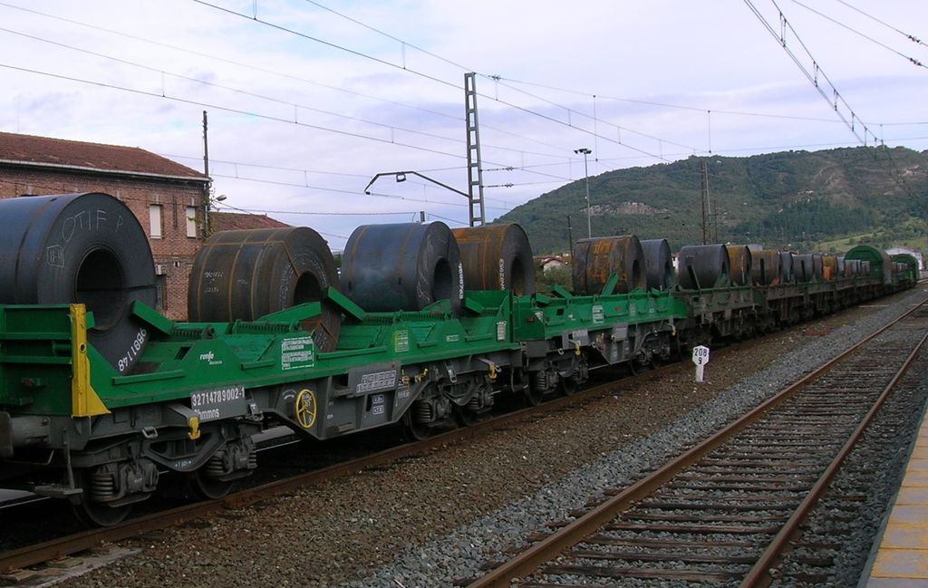 Composição de vagões plataforma RENFE tipo Sgs carregados com contentores.
