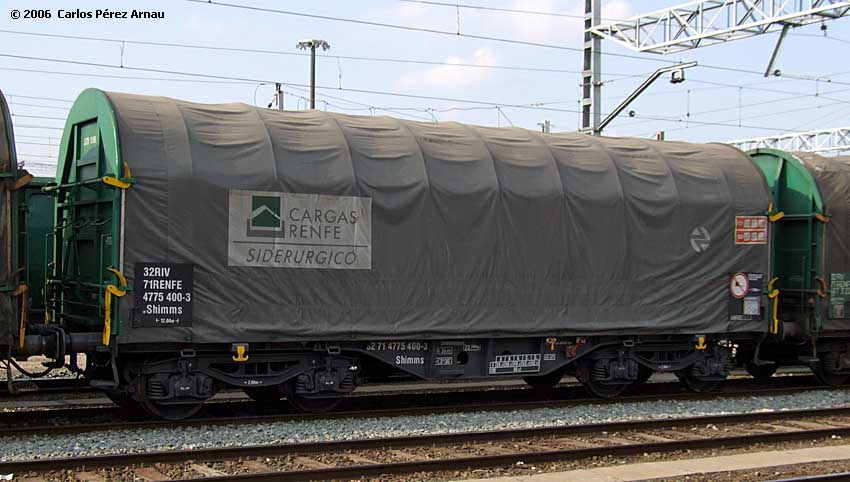 Vagon cerrado tipo Shimmns, para el transporte de bobinas metalicas. Perteneciente a Cargas Renfe Siderurgico. Closed coach type Shimmns, for the transport of metallic bobbins. Belonging to Charges Renfe Siderurgico. Station: Almansa (Albacete) - 02/08/2005