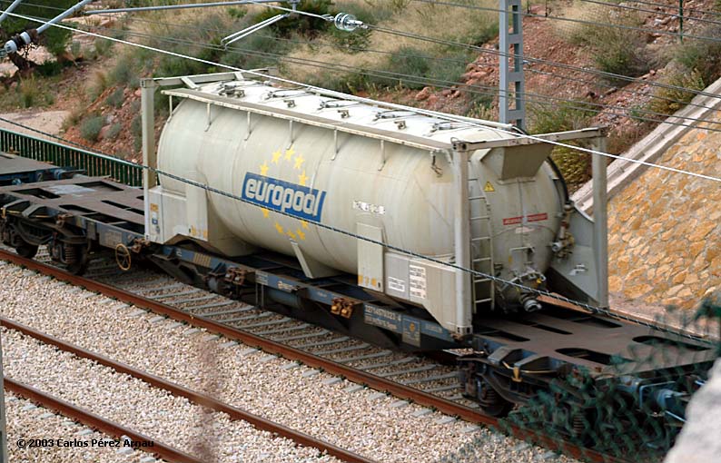 Vagon Plataforma / Flat car. Renfe: MMqc / UIC: Sgns Company: RENFE-Transporte Combinado Customer: CONTANK Station: Benicassim (Castellon) 22/11/2003