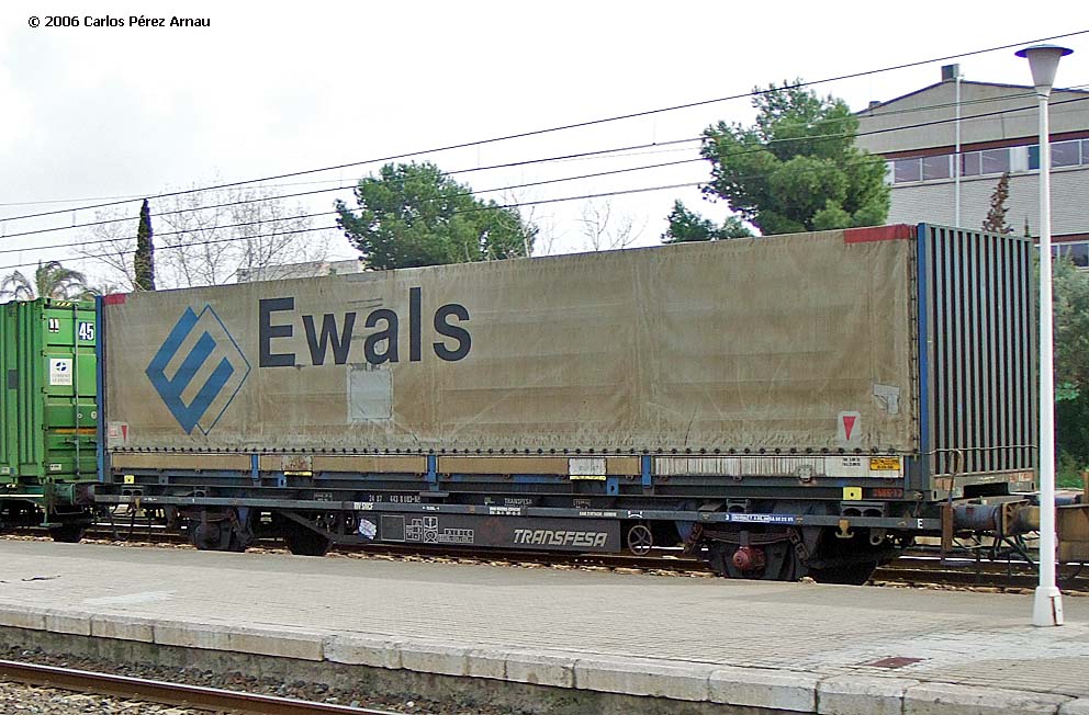 Vagon plataforma de la empresa TRANSFESA, matriculado en la SNCF, con un contenedor de la empresa Ewals. Coach platform of the company TRANSFESA, registered in the SNCF, with a container of the company Ewals. Station: Reus (Tarragona) - 23/02/2006