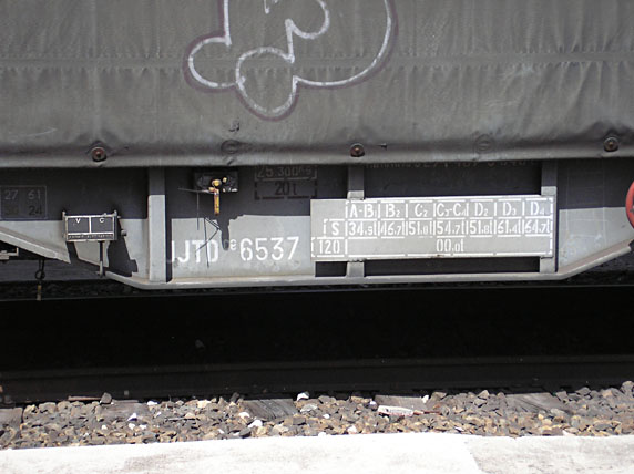 RENFE flat wagon type Sgss used to transport containers. Parked near the "Parque de Mercadorias" in Bobadela (Lisbon - Portugal) on March 2003. Side detail with UIC numbering. Foto/Photo: Ivan Gomes (kronostec@mail.pt) |