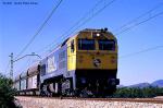 Locomotora diesel 319 asignada a la unidad de "Cargas" con un tren de tolvas.Almazora-Castelló 5/99 Renfe diesel locomotive class 319. Photo : Carlos Pérez Arnau (carlosperez@studio3.es) |