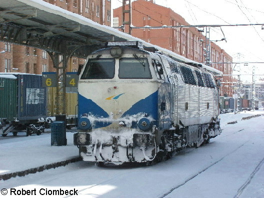| Locomotora diesel RENFE 333-017-2 con decoración de Grandes Líneas a la cabeza de coches Talgo III en la estación de Madrid-Chamartín (09.12.2005). © Robert Ciombeck/ Email: RCiombeck@aol.com |