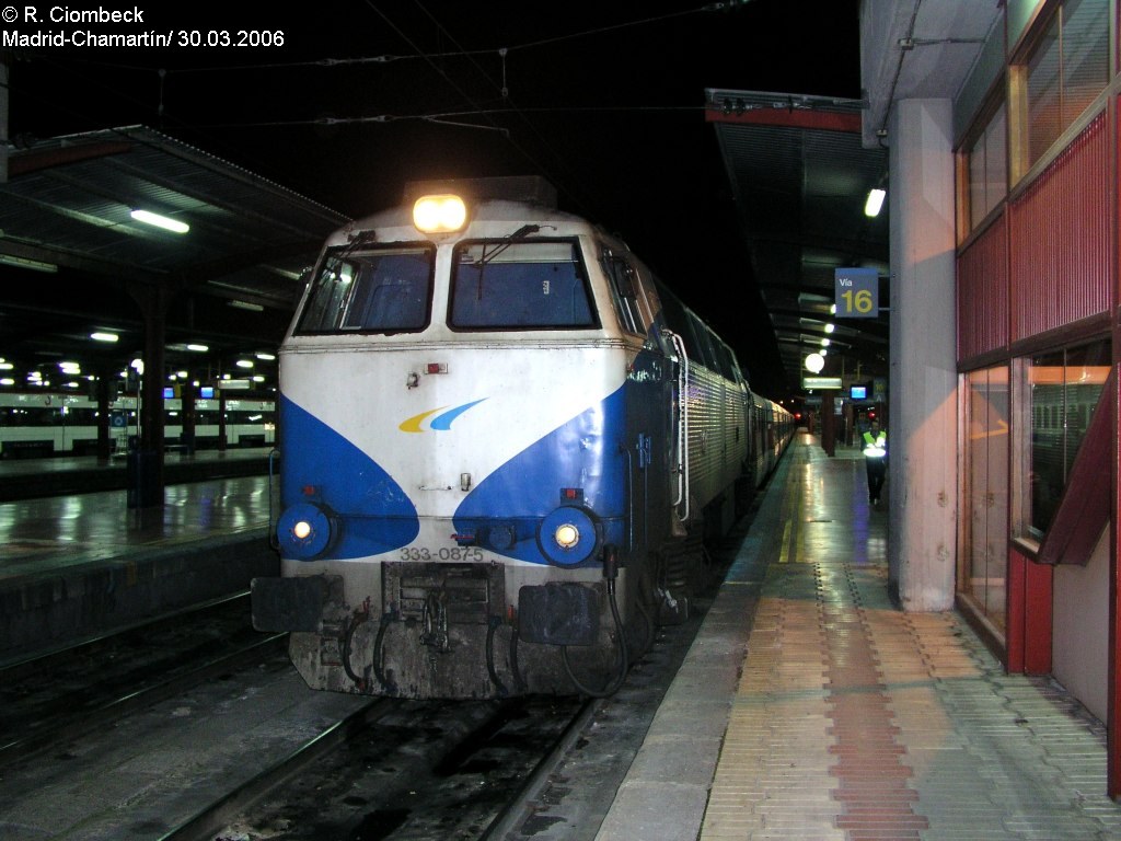 | Locomotora diesel RENFE 333-087-5 con decoración de "Grandes Líneas" al frente del TRENHOTEL 332 "Lusitania" con destino a Lisboa Santa Apolonia en la estación de Madrid-Chamartín (30.03.2006). © Robert Ciombeck/ Email: RCiombeck@aol.com |