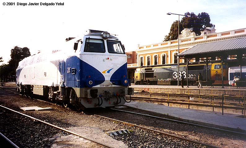 Locomotora diesel 333-081-8, construida por MACOSA en Valencia con licencia de General Motors-Locomotives y Nohab (N.1539 de 1976), 120 tm, Velocidad maxima 146 km. Diesel locomotive 333-081-8, built by MACOSA in Valencia with license of General Motors-Locomotives and Nohab (N.1539 1976), 120 tm, Speed maximum 146 km. Station: Murcia del Carmen 19:11 10/04/2001