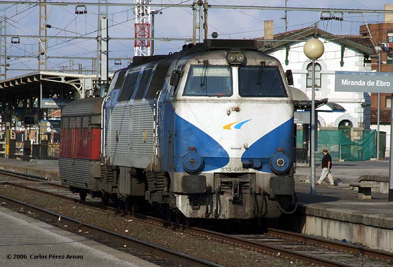 Locomotora 333.087, de Grandes Lineas con el furgon del Talgo III, a la espera de un nuevo servicio. Locomotive 333.087, of Big Lines with the truck of the Talgo III, to the wait of a new service. Station: Miranda de Ebro (Burgos) - 15/08/2006