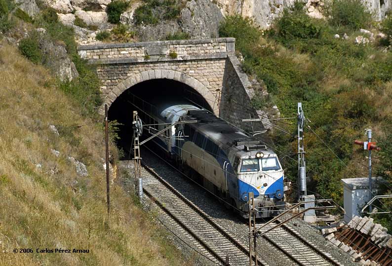Locomotora 333.091 con un tren de Grandes Lineas, pasando el desfiladero de Pancorbo. Locomotive 333.091 with a train of Big Lines, passing Pancorbo's gorge. Station: Pancorbo (Burgos) - 15/08/2006