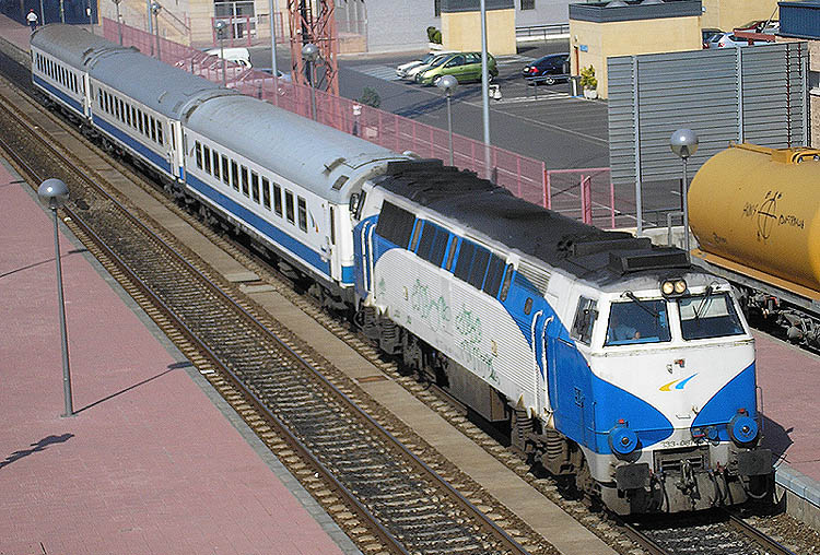 | Locomotora diesel RENFE 333-089-1 pintada con los colores de grandes líneas en cabeza del servicio TALGO 463 "Mare Nostrum" procedente de Montpellier con destino a Cartagena, efectuando parada en la estación subterránea Elche-Parque (11.11.2006). © Robert Ciombeck/ Email: RCiombeck@aol.com |