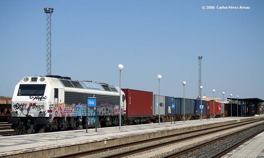 Locomotora 333-308 de Mercancias con un tren de contenedores Locomotive 333-308 of Goods with a train of containers Station: Merida (Badajoz) - 21/08/06