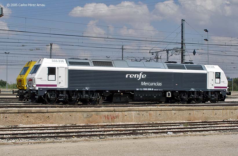 Locomotora 333.336 con el nuevo esquema de pintura, para las locomotoras de mercancias. Locomotive 333.336 with the new scheme of painting, for the locomotives of commodity. Station: Albacete - 02/08/2005