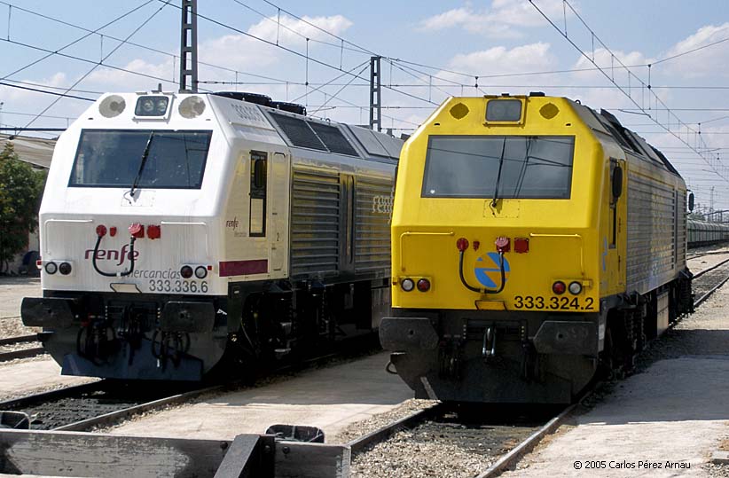 Aqui podemos observar ademas de la diferencia de esquema de pintura, alguna diferencia mas como el tamaño de salida de las bocinas, en las nuevas 333.3. Here we can observe besides the difference of scheme of painting, someone differentiates mas, as the size of exit of the horns, in the new ones 333.3. Station: Albacete - 02/08/2005