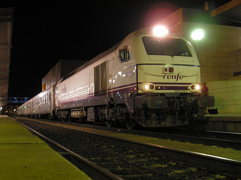 Renfe - Diesel Locomotive 334.015, with the "Surexpress" from Lisboa to Hendaya nigth train. Salamanca, 24/08/2008.