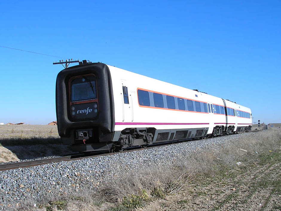 Renfe - Doble composición 594.102 + 594.602 y 594.105 + 594.605 procedente de Madrid, parte hacia Salamanca de la estación de Peñaranda de Bracamonte,