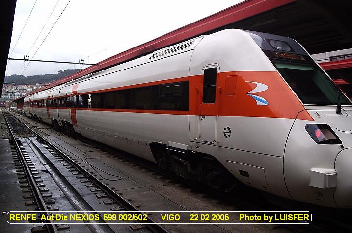 RENFE DMU NEXIOS 598 002/502 (UIC Number) in VIGO Station (22 02 2005) RENFE Aut Die NEXIOS 598 002/502 (Numeração UIC) na Estação de VIGO Photo by LUISFER - Estudos e Realizações Ferroviárias (http://luisfer.fotopic.net) (blogluisfer@sapo.pt) |