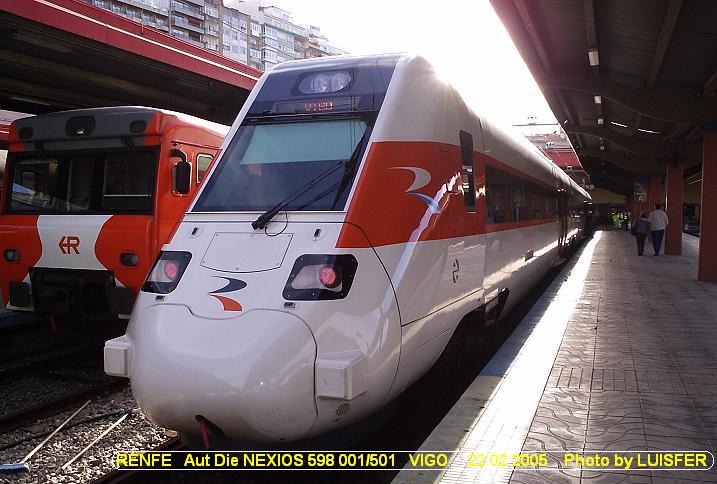 RENFE DMU NEXIOS 598 001/501 in VIGO Station (22 02 2005) RENFE Aut Die NEXIOS 598 001/501 na Estação de VIGO Photo by LUISFER - Estudos e Realizações Ferroviárias (http://luisfer.fotopic.net) (blogluisfer@sapo.pt) |