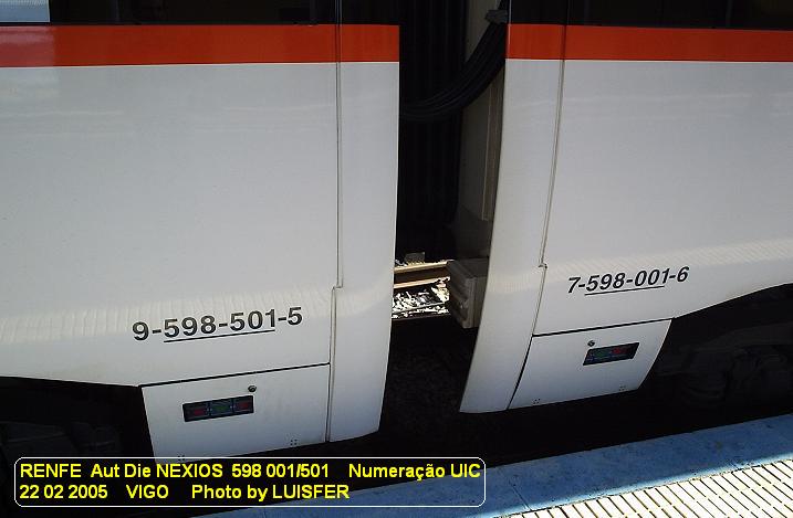 RENFE DMU NEXIOS 598 001/501 (UIC Number) in VIGO Station (22 02 2005) RENFE Aut Die NEXIOS 598 001/501 (Numeração UIC) na Estação de VIGO Photo by LUISFER - Estudos e Realizações Ferroviárias (http://luisfer.fotopic.net) (blogluisfer@sapo.pt) |