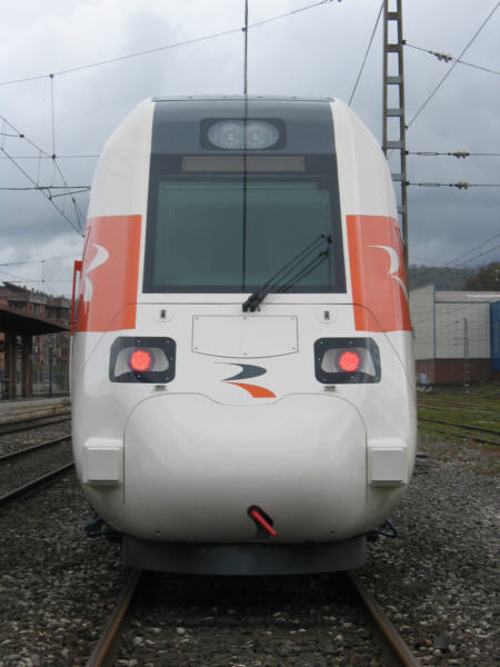 This Mk2 TRD has aerodynamic end-faces, unlike TRD 594s. It has also been fitted with CAF tilting-system SIBI. One can notice some resemblance with X72500s of SNCF. Would-be AVE-120s (variable-gauge, 250kph, Mainline traffic) will have a very close outer aspect, with more central vestibules and 4 cars instead of 3, though. TRD 598s will run on fast regional services, primarily on routes already served with TRD 594s, which will be themselves displaced somewhere else. These are probably the last DMUs ever ordered by RENFE. Pic by Titan (titan@tranvia.org) (Acknowledgments) from Tranvia.org Posting and comment by P.L.Guillemin (plguillemin@yahoo.fr) |