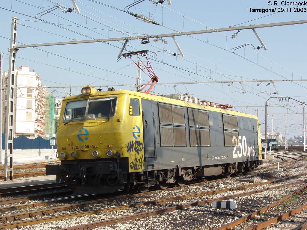 | Locomotora eléctrica RENFE 250-006-4 construida por CAF con licencia Krauss Maffei maniobrando en la estación de Tarragona (09.11.2006). © Robert Ciombeck/ Email: RCiombeck@aol.com |