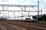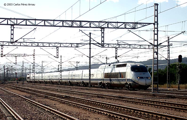 This AVE-100 is seen coming from LLeida-Pirineus and heading towards Madrid-Puerta de Atocha. This was one of the very few "promotional services", which were supposed to introduce VIPs to the Madrid-Lerida HSL, shortly before its intended opening to the public. Loads of technical failures forced RENFE to cancel most of these and to postpone revenue services until 11th October 2003. March 2003. Photo by Mario Pelañosa (abafayud@hotmail.com) (Acknowledgements), from Tranvia.org Posting and Comment by P.L.Guillemin (plguillemin@yahoo.fr) |