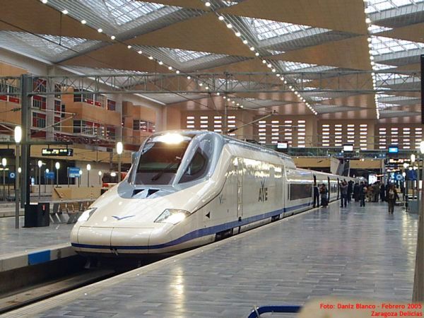 La aerodinamica de la serie 102, fabricada por Talgo, es mas parecida a la estetica de los trenes Bala japoneses, que a los trenes europeos. The aerodynamics of the series 102, made by Talgo, are similar to the aesthetics of the trains Bullet Japanese, more than to the European trains. Station: Zaragoza - 09/08/2005