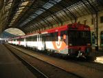 While this formation is accommodated on the only broad-gauge track (1668mm-5ft6in) used in passenger traffic at Cerbère, it runs at half-power only, as the whole Cerbère-Portbou complex is under 1.5kV DC, whatever the track-gauge. Cerbère. 5th October 2004.