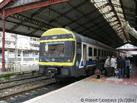 | Unidad RENFE UT-448 "Intercity" de tres coches perteneciente a "Grandes Líneas" en la estación de San Sebastián realizando el servicio INTERCITY 203 dirección Hendaya (04/2004). © Robert Ciombeck/ RCiombeck@aol.com |