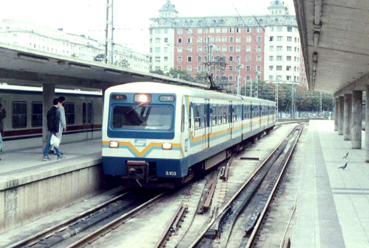 EuskoTren emu 3103 placed at San Sebastián-Amara 7-10-1989. This series is used in Bilbao-San Sebastián line.