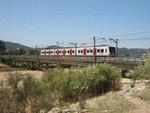 Class 213 EMU of FGC, seen bound to Barcelona-Plaça d'Espanya, beween the stations of Martorell-Central and Martorell-Vila, on the Llobregat (FGC) Bridge.
