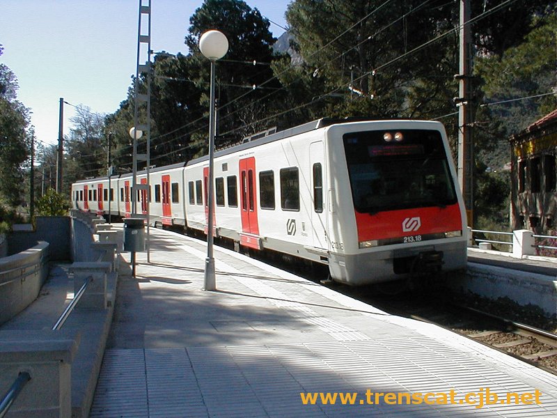 Una unitat 213 entrant a l'estació de Montserrat-Aeri (Catalunya) el 4/4/03. Foto: Bernat Borràs A 213 unit in Montserrat-Aeri station (Catalonia) on 4/4/03. Photo by: Bernat Borràs www.trenscat.cjb.net |