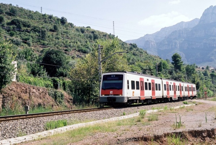 • Foreground: 2 Class 447 EMUs of Renfe-Cercanías, seen on a Rodalies service (Line C4: San Vincenç-de-Calders or Martorell <---> Manresa); and • Middle: Class 213 EMU of FGC, seen on a (Vallès) Regional service. Background (top): Montserrat. Martorell. 4th June 2009.