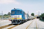 Locomotora diesel alquilada por Comsa. Construida por ELECTROPUTERE en Cracovia (Rumania) en 1978. Su propietaria es la empresa Rumana SAAF. Diesel locomotive rented by Comsa. Built by ELECTROPUTERE in Cracovia (Rumania) in 1978. Their landlady is the Rumanian company SAAF. Almunia de Doņa Godina (Zaragoza) 9/8/2001