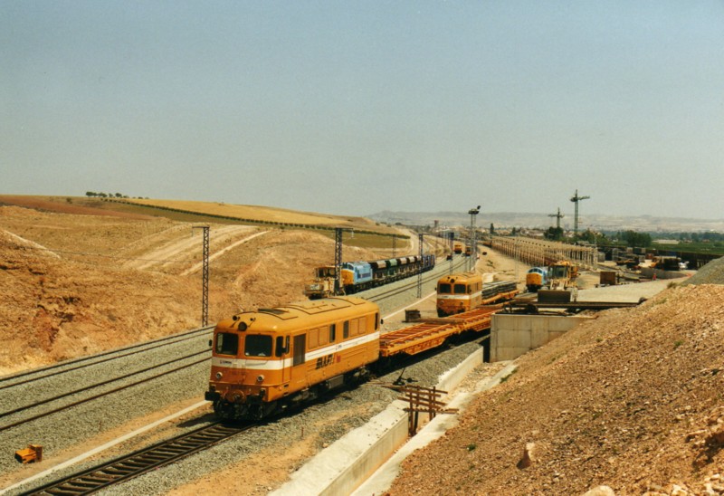 Esta locomotora Bo-Bo de ancho internacional trabajara en las obras del AVE Madrid-Barcelona. This locomotive Bo-Bo is of wide international. Madrid-Barcelona worked in the works of the AVE. Almunia de Doņa Godina (Zaragoza) 9/8/2001