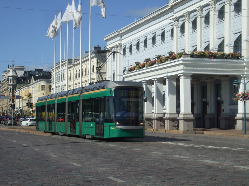 A 203-as pályaszámú Varoitram Helsinki városháza előtt.